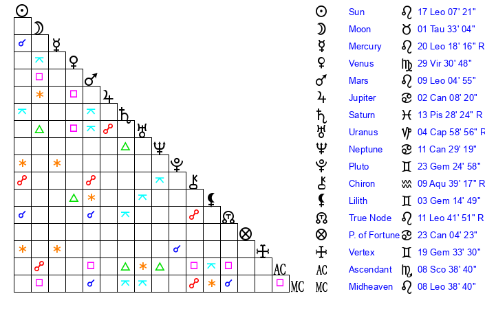 | Moon | 1 Taurus 40 | 5 Pisces 50 | 28 Leo 38 |