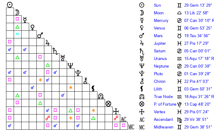 | Sun | 29 Gemini 13 | 0 Cancer 34 | 15 Libra 19 |