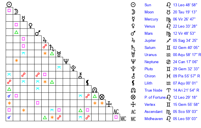 Sun | 13 Leo 49 | 14 Leo 29 | 5 Sagittarius 7 |