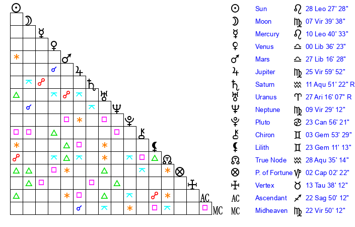 Moon | 7 Virgo 48 | 13 Leo 58 | 29 Capricorn 16 |