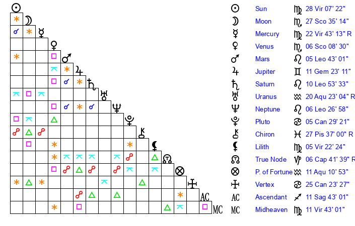 | Moon | 27 Scorpio 38 | 27 Virgo 27 | 11 Scorpio 21 |
