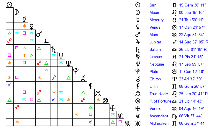 | Sun | 15 Gemini 38 | 16 Gemini 12 | 22 Virgo 31 |