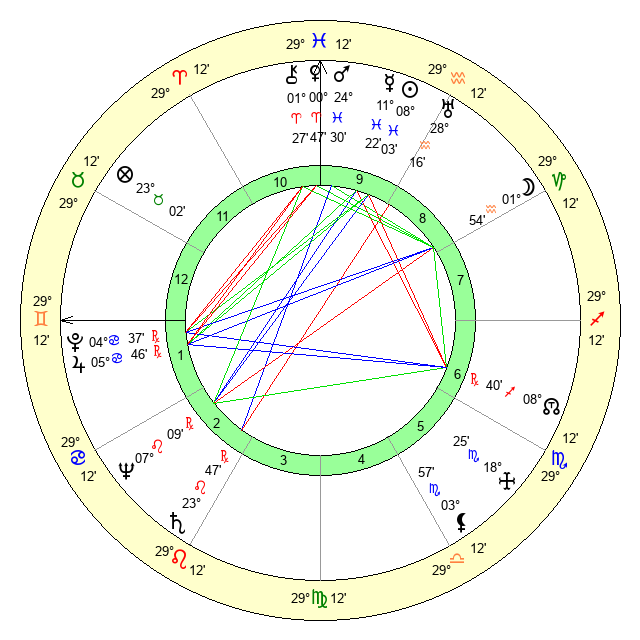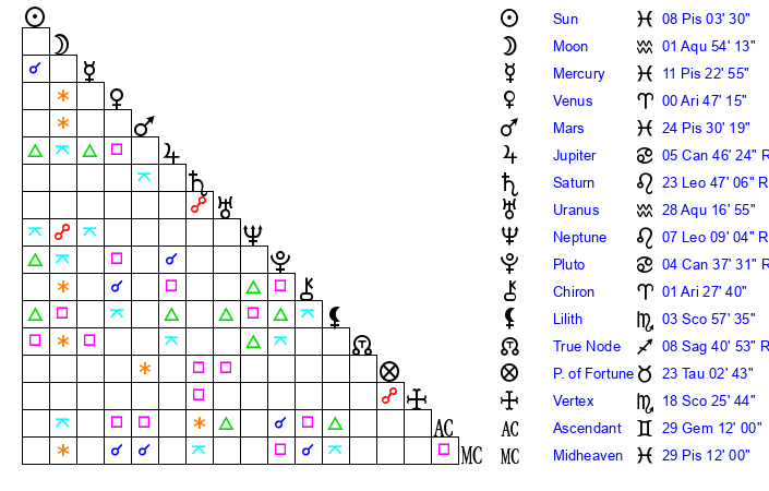 | Sun | 8 Pisces 3 | 9 Pisces 21 | 21 Gemini 36 |