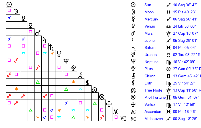 | Sun | 10 Sagittarius 36 | 11 Sagittarius 47 | 11 Pisces 57 |