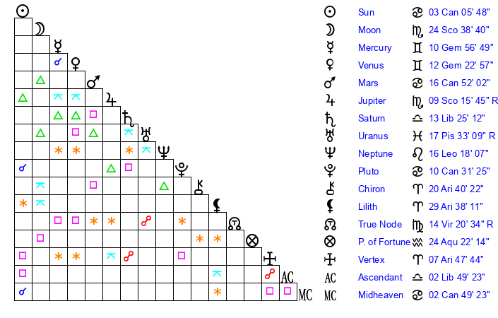 | Sun | 3 Cancer 6 | 4 Cancer 23 | 11 Libra 25 |