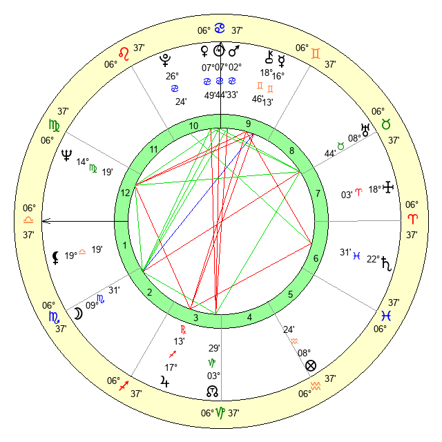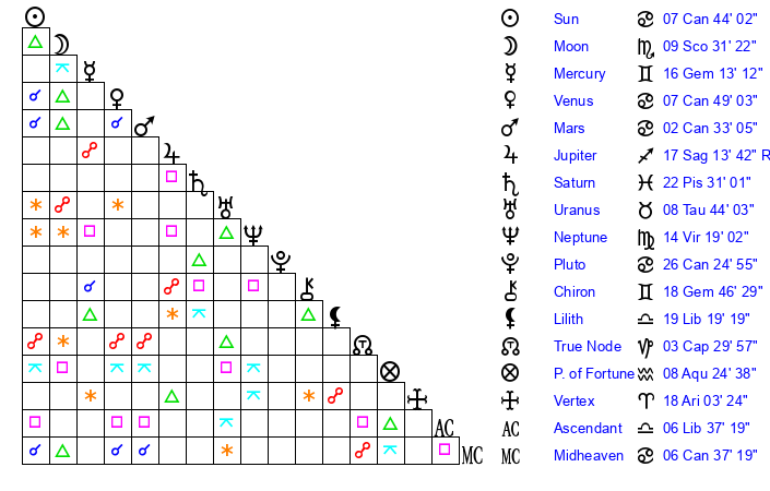 | Sun | 7 Cancer 44 | 8 Cancer 12 | 3 Libra 25 |