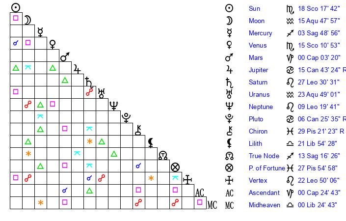 | Moon | 15 Aquarius 48 | 18 Pisces 59 | 2 Capricorn 56 |