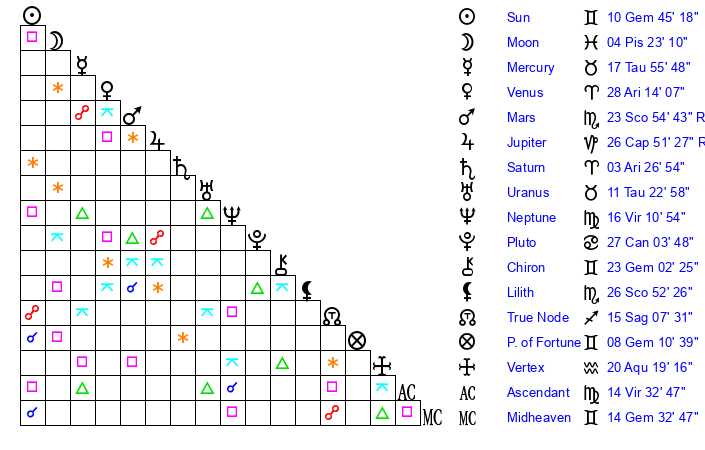 | Moon | 4 Pisces 13 | 24 Leo 48 | 1 Gemini 1 |