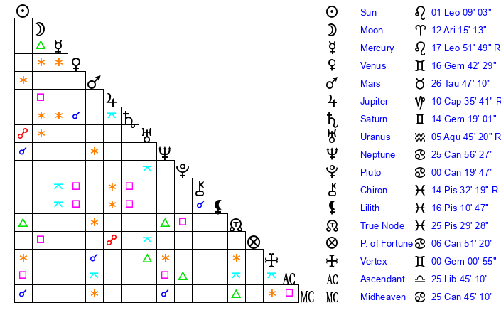 | Moon | 12 Aries 9 | 0 Leo 46 | 17 Taurus 50 |