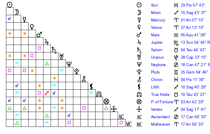 Sun | 29 Pisces 58 | 1 Aries 20 | 20 Cancer 9 |