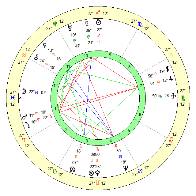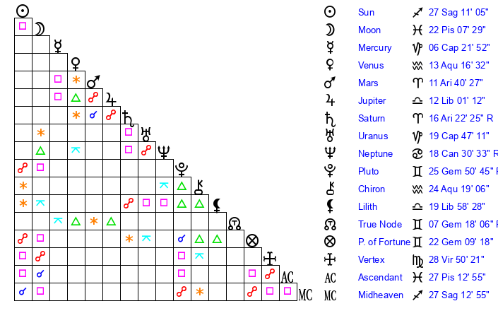 | Moon | 22 Pisces 9 | 22 Leo 23 | 16 Gemini 6 |