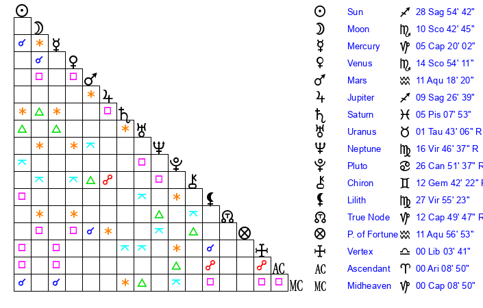 | Moon | 10 Scorpio 40 | 18 Capricorn 21 | 25 Aquarius 10 |