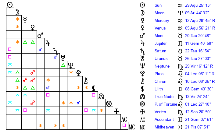| Mercury | 12 Aquarius 28 | 7 Pisces 46 | 12 Gemini 5 |