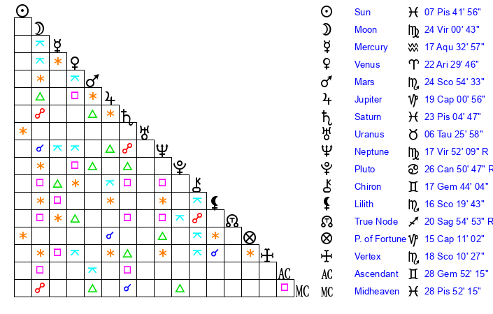 | Sun | 7 Pisces 41 | 8 Pisces 21 | 4 Gemini 2 |