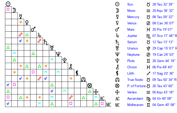 Pluto | 26 Gemini 44 | 3 Aquarius 45 | 28 Gemini 56 |