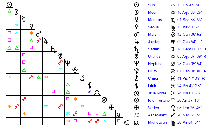 | Sun | 15 Libra 47 | 16 Libra 39 | 8 Aquarius 58 |