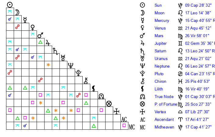 | Moon | 17 Leo 12 | 19 Capricorn 58 | 21 Cancer 34 |