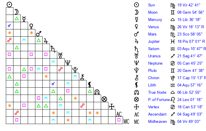 | Moon | 8 Gemini 48 | 11 Gemini 23 | 7 Sagittarius 45 |
