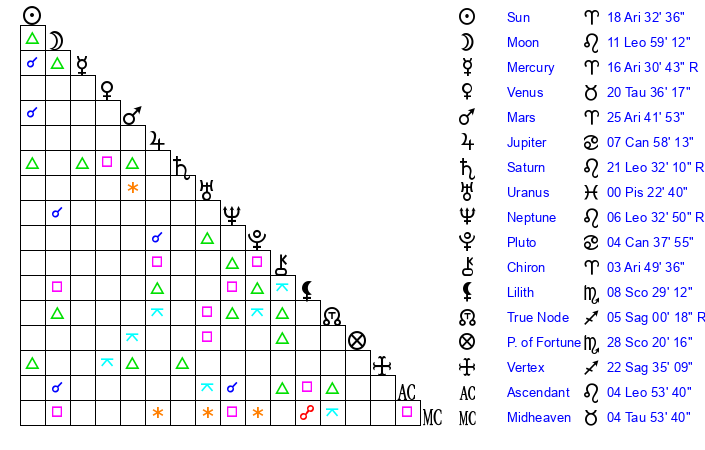Sun | 18 Aries 32 | 19 Aries 51 | 0 Leo 29 |