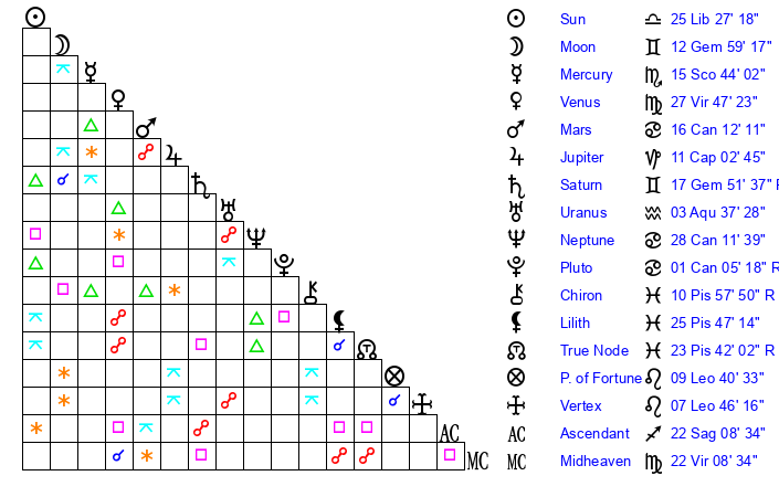 | Moon | 12 Gemini 59 | 3 Libra 25 | 18 Cancer 34 |