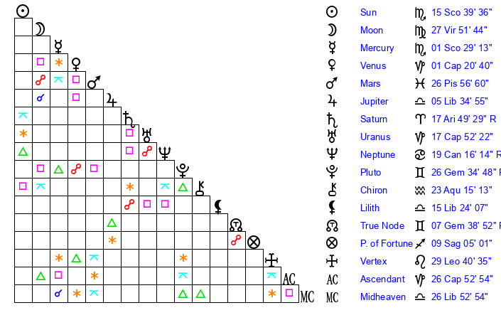| Sun | 15 Scorpio 40 | 16 Scorpio 47 | 12 Pisces 15 |
