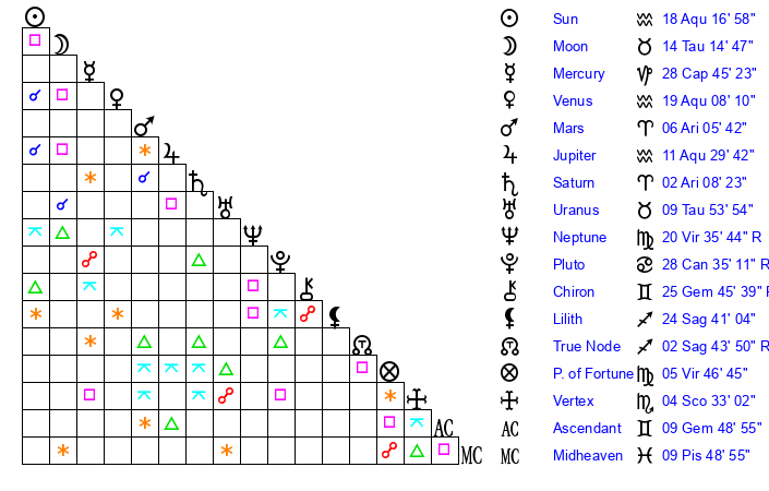 | Sun | 18 Aquarius 16 | 19 Aquarius 10 | 14 Taurus 31 |