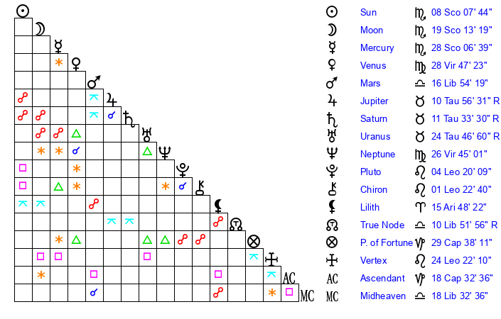 | Moon | 19 Scorpio 12 | 2 Pisces 57 | 0 Capricorn 1 |