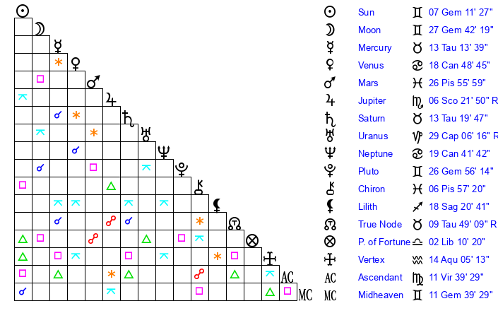 Pluto | 26 Gemini 56 | 3 Aquarius 40 | 28 Gemini 59 |