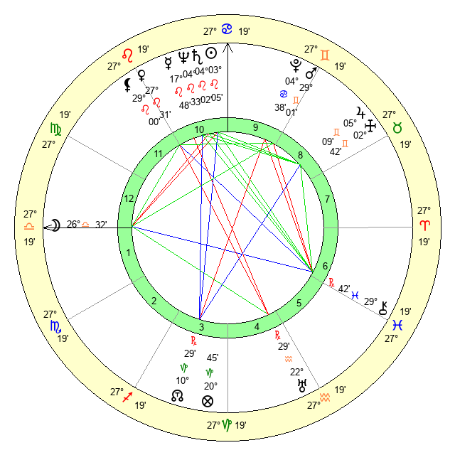 | Moon | 26 Libra 27 | 27 Leo 48 | 13 Libra 25 |