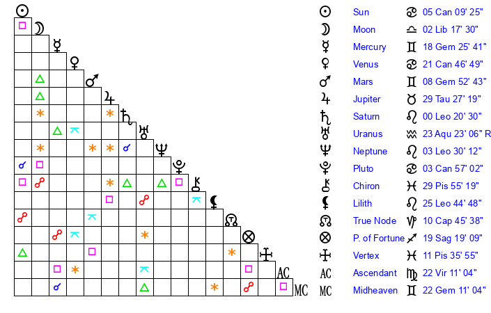 | Sun | 5 Cancer 9 | 6 Cancer 1 | 19 Libra 29 |