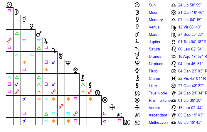 | Sun | 24 Libra 59 | 25 Libra 34 | 15 Aquarius 20 |