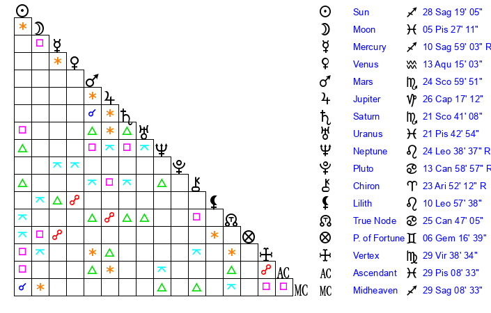 | Sun | 28 Sagittarius 19 | 29 Sagittarius 18 | 8 Aries 15 |