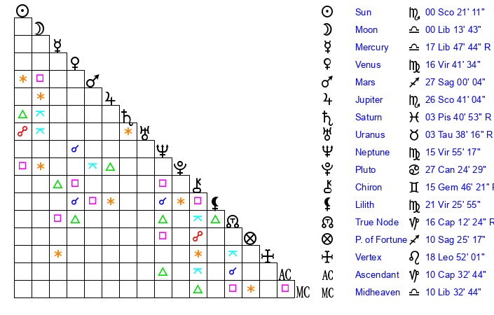 | Sun | 0 Scorpio 21 | 1 Scorpio 32 | 1 Aquarius 30 |