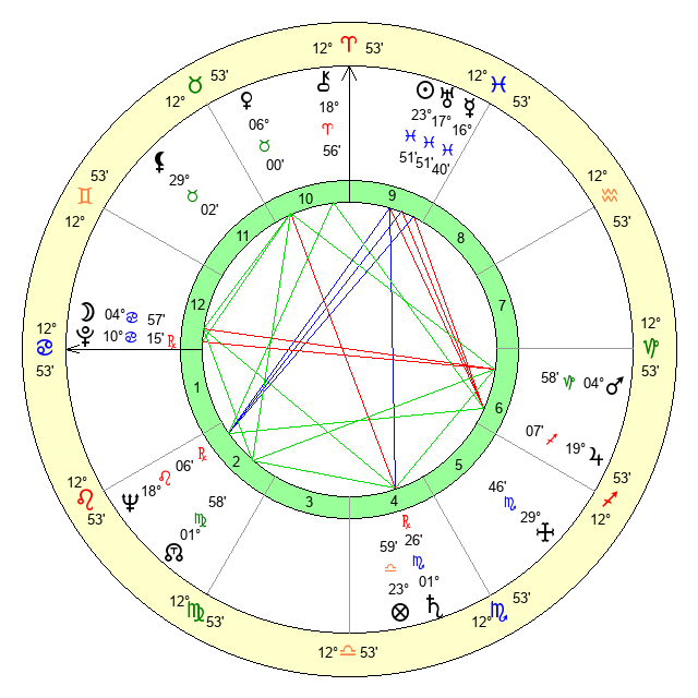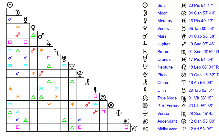 | Moon | 4 Cancer 51 | 28 Virgo 52 | 27 Pisces 27 |