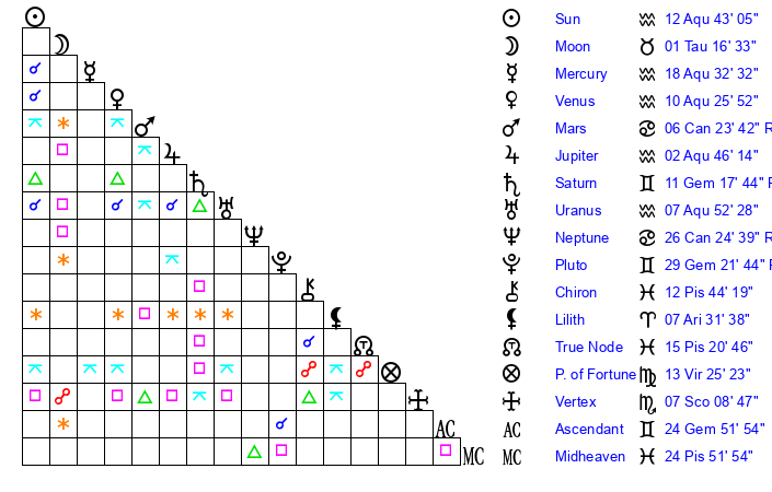 | Sun | 12 Aquarius 43 | 13 Aquarius 47 | 2 Gemini 21 |