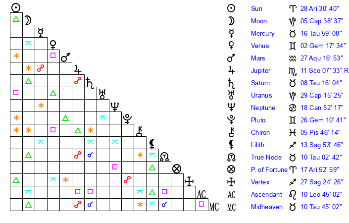 Mars | 27 Aquarius 18 | 0 Leo 38 | 16 Taurus 59 |