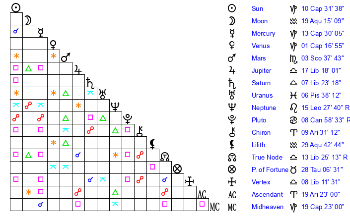 | Moon | 19 Aquarius 17 | 3 Aquarius 26 | 2 Sagittarius 5 |