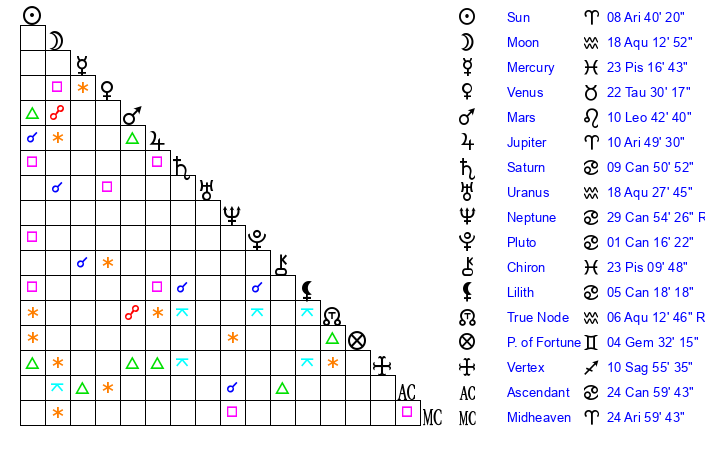 | Moon | 18 Aquarius 16 | 12 Aries 48 | 15 Aquarius 10 |