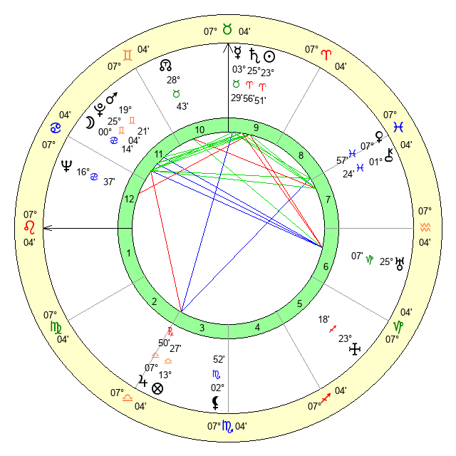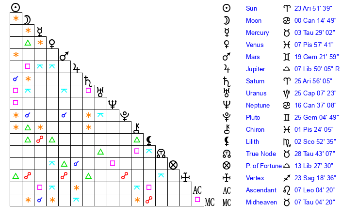 | Sun | 23 Aries 52 | 25 Aries 0 | 14 Leo 17 |