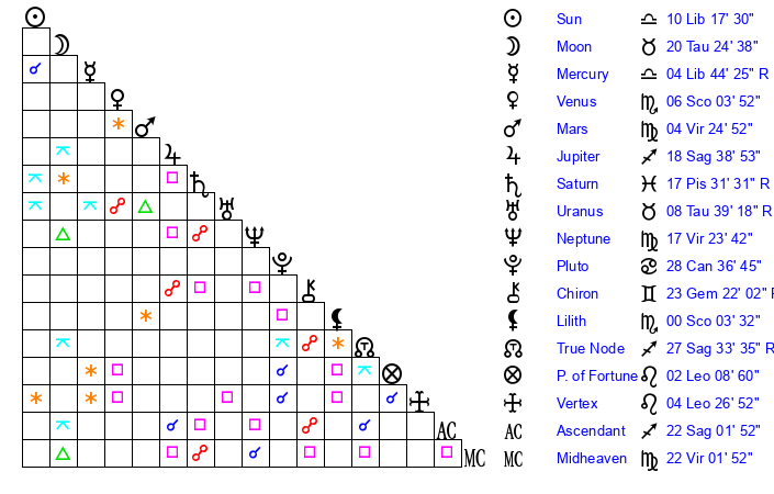 | Neptune | 17 Virgo 23 | 0 Aries 28 | 18 Virgo 55 |