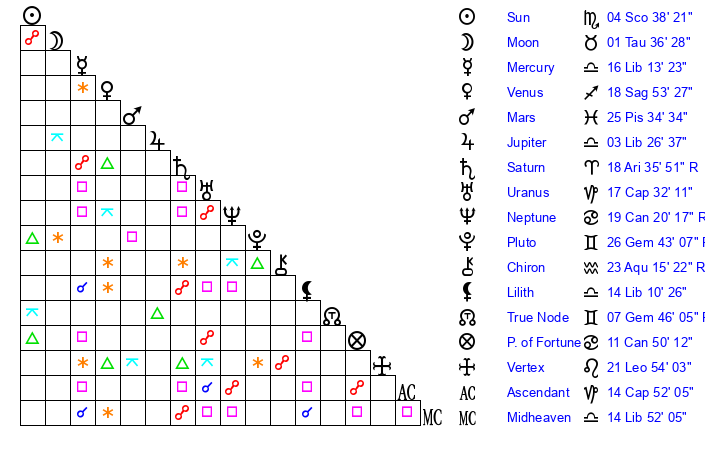 | Mercury | 16 Libra 14 | 22 Scorpio 45 | 4 Aquarius 40 |