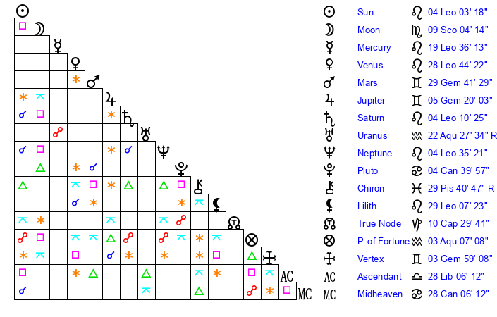 | Mercury | 19 Leo 36 | 12 Leo 6 | 25 Scorpio 2 |