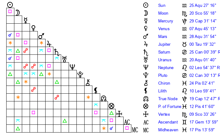 | Sun | 25 Aquarius 27 | 26 Aquarius 15 | 11 Gemini 33 |