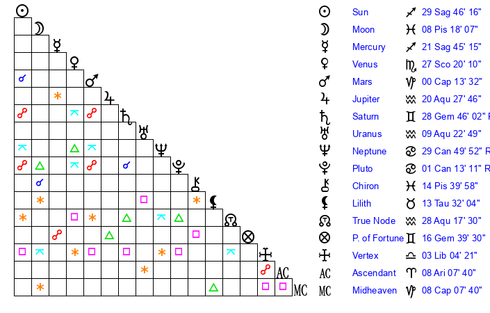 | Moon | 6 Pisces 45 | 0 Aquarius 3 | 28 Pisces 40 |