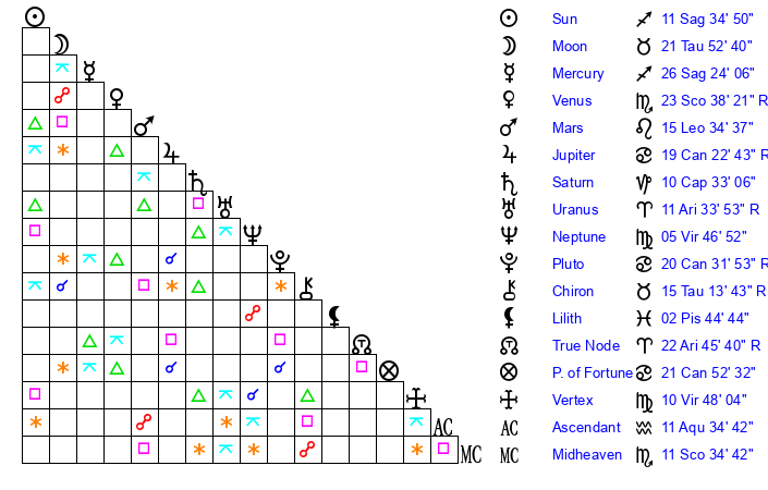 | Moon | 21 Taurus 54 | 20 Capricorn 28 | 12 Scorpio 22 |