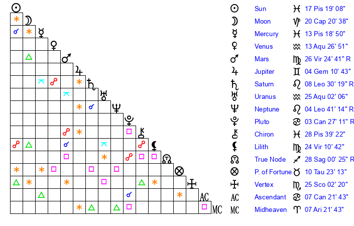 | Saturn | 9 Leo 18 | 21 Pisces 34 | 12 Leo 49 |