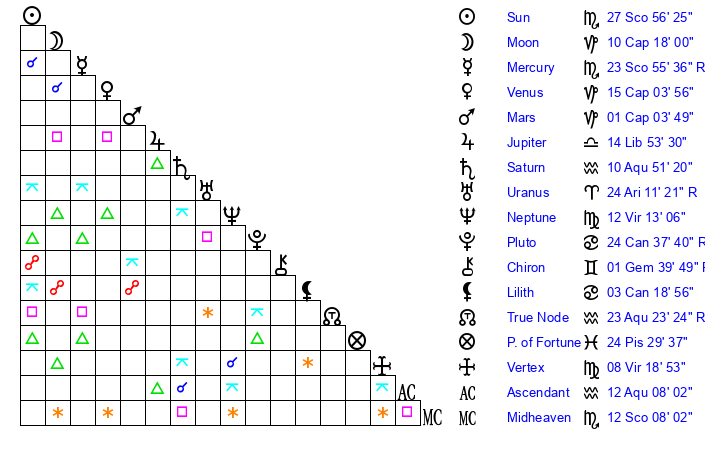 | Venus | 15 Capricorn 3 | 17 Scorpio 16 | 8 Aquarius 27 |