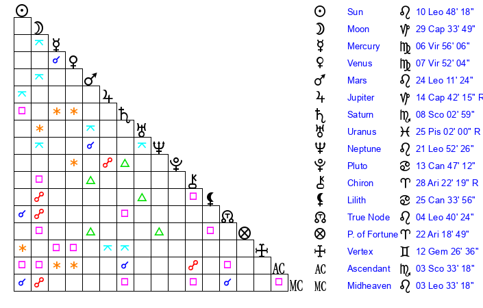 | Sun | 10 Leo 48 | 11 Leo 36 | 18 Scorpio 48 |