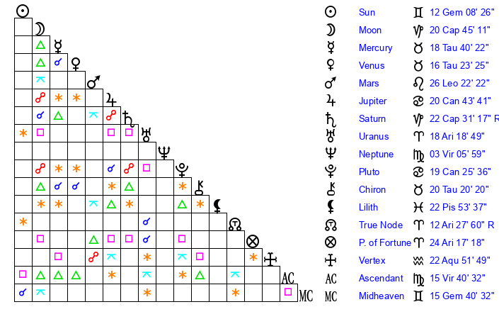 | Sun | 12 Gemini 8 | 13 Gemini 22 | 12 Virgo 9 |