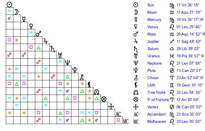 | Sun | 17 Virgo 26 | 18 Virgo 0 | 28 Sagittarius 19 |